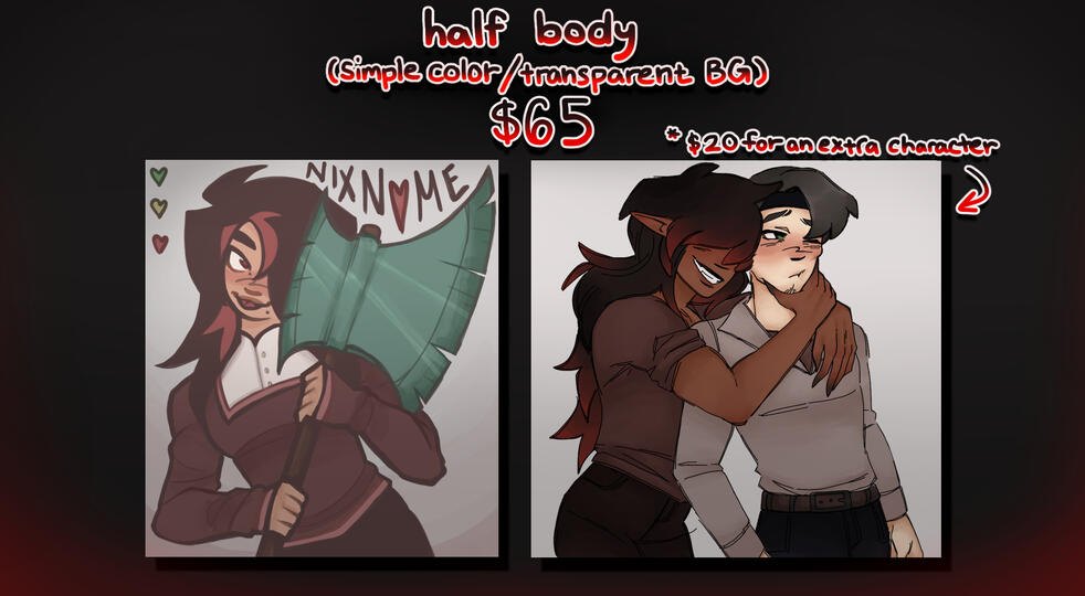 please give a detailed description of what you want (ex. oc references, inspiration, a general vibe you're thinking of) OR a doodle of the posing/ idea is highly appreciated!